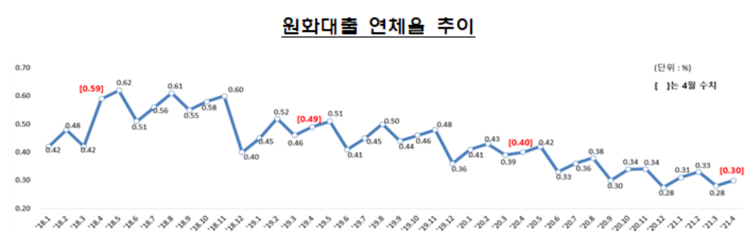 금융감독원이 16일 발표한 '4월말 국내은행의 원화대출 연체율 현황' 자료에 따르면 국내은행의 원화대출 연체율은 0.30%로 전월말(0.28%) 대비 0.02%포인트(P) 상승했다.