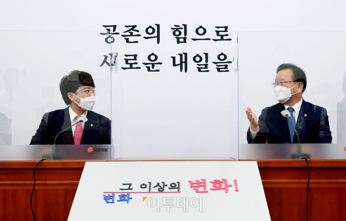 이준석 국민의힘 대표(왼쪽)가 16일 오전 서울 여의도 국회에서 인사차 방문한 김부겸 국무총리와 대화를 나누고 있다.