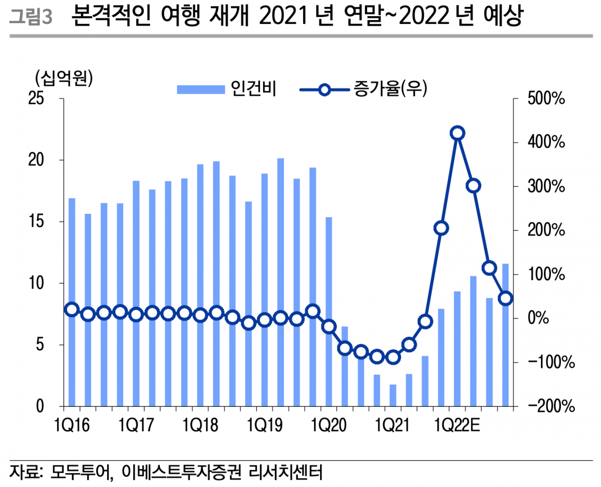 올해 3분기까지 출입국자수 정상화와 실적 회복은 어렵지만 △백신 접종률 확대 △2주 자가격리 면제에 따른 여행업 회복에 대한 기대감은 여전히 유효하기 때문이다.