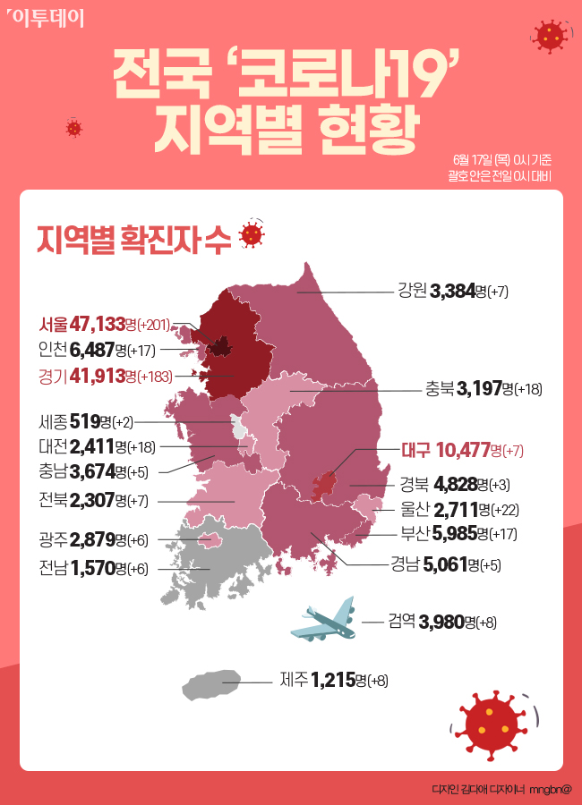 전국 시·도별 코로나19 누적 확진자 수는 △서울 4만7133명 △경기 4만1913명으로 가장 많은 비중을 차지했다. 이어 △대구 1만477명 △인천 6487명 △부산 5985명 △경남 5061명 △경북 4828명 △검역 3980명 △충남 3674명 △강원 3384명 △충북 3197명 △광주 2879명 △울산 2711명 △대전 2411명 △전북 2307명 △전남 1570명 △제주 1215명 △세종 519명 순으로 나타났다.
