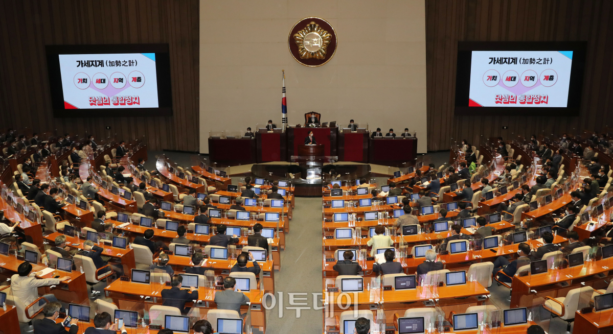 17일 여의도 국회에서 본회의가 열린 가운데 김기현 국민의힘 원내대표가 교섭단체 대표연설을 하고 있다. 김 원내대표는 가치, 세대, 지역, 계층을 확장해 나아가다는 ‘가세지계(加勢之計)’를 펼치겠다고 말했다.