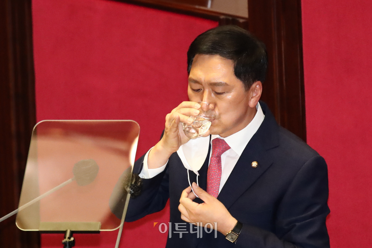 국민의힘 김기현 원내대표가 17일 국회에서 열린 본회의에서 교섭단체 대표연설을 하던 중 물을 마시고 있다.