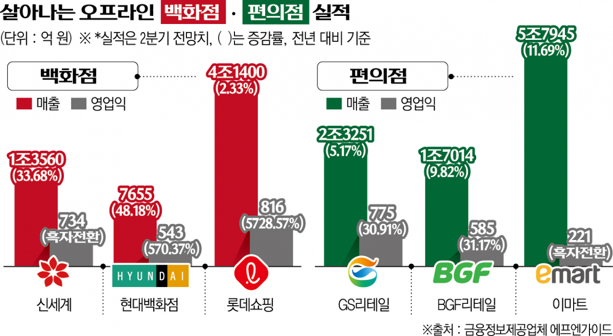 오프라인 유통업계의 회복세가 뚜렷해지고 있다. 따뜻해지는 날씨에 코로나19 장기화로 인한 피로감, 백신 접종에 따른 종식 기대감 등 여러 요인이 합해져 오프라인 소비 수요가 늘고 있어서다. 지난해 코로나19 직격탄을 맞아 휘청였던 백화점과 편의점의 2분기 실적에도 청신호가 들어왔다.