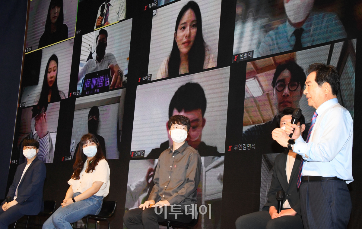 더불어 민주당 정세균 전총리가 17일 오후 서울 상암동 누리꿈스퀘어에서 대통령선거 출마선언식에서 청년들과 '미래세대와의 대화' 를 하고 있다. 국회사진취재단