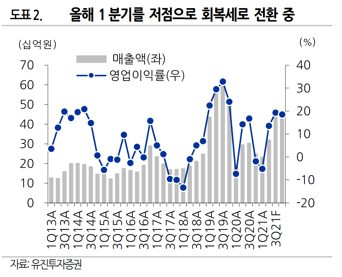 유진투자증권은 오이솔루션의 2분기 영업이익을 전분기 대비 2.6% 성장한 43억 원을 전망했다. 박 연구원은 “2분기 오이솔루션의 5G 관련 해외매출액은 100억 원대 후반으로 예상한다”며 “미국 버라이즌향 매출과 일본 KDDI, NTT 도코모향 매출이 증가할 것으로 예상하기 때문”이라고 설명했다.