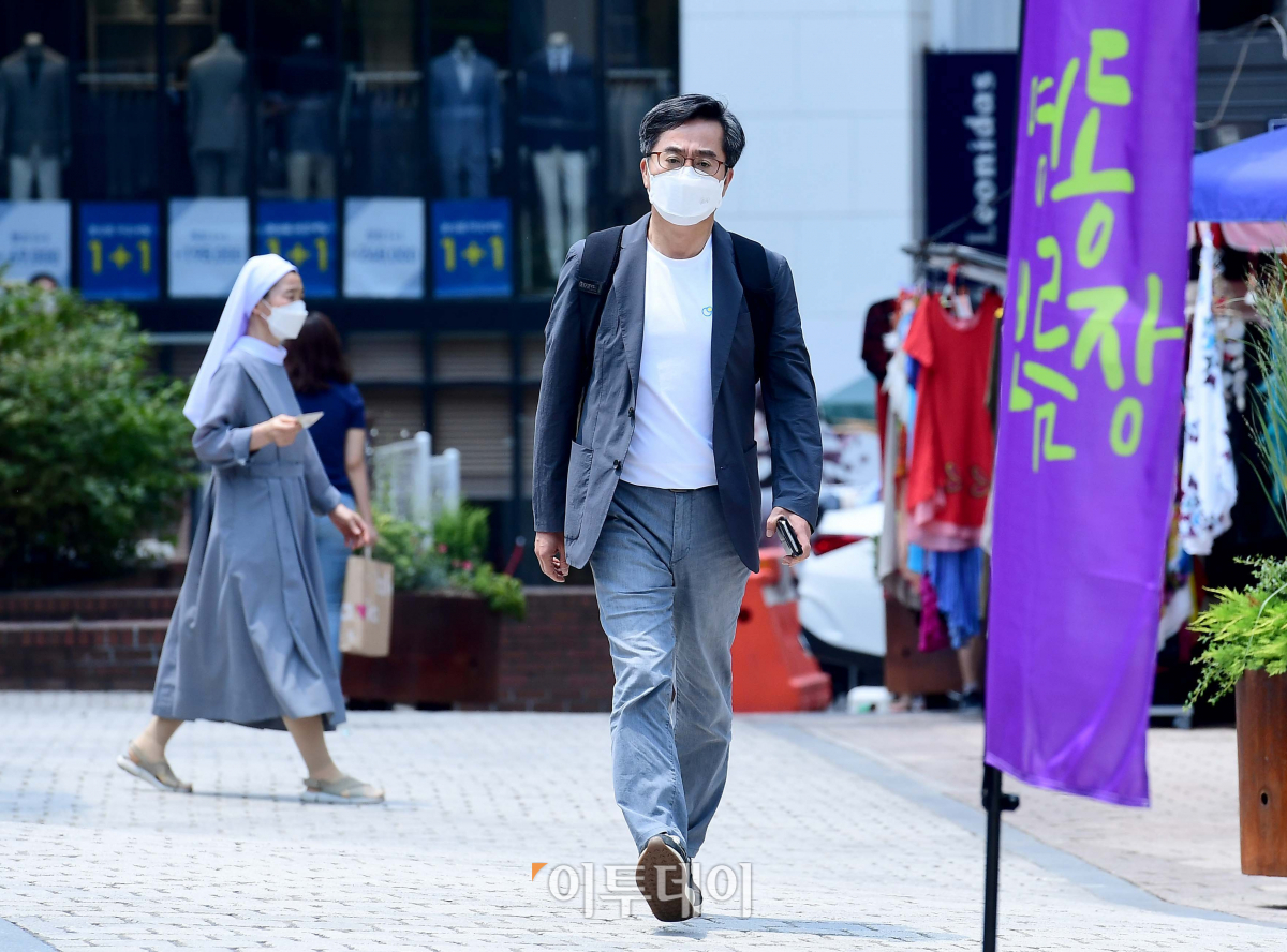 김동연 전 부총리가 20일 서울 중구 명동성당 내 무료급식소 명동밥집에서 노숙인 무료급식봉사를 하기위해 경내로 들어서고 있다.