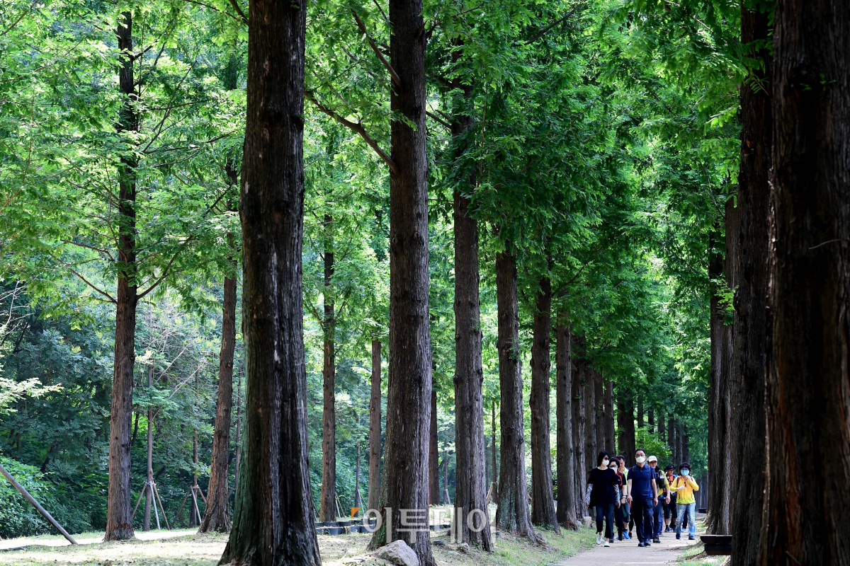 1년중 낮이 가장 길다는 절기상 하지(夏至)를 하루 앞둔 20일 서울 마포구 하늘공원 메타세쿼이아길에서 시민들이 녹음이 짙어지는 초여름의 정취를 만끽하고 있다.