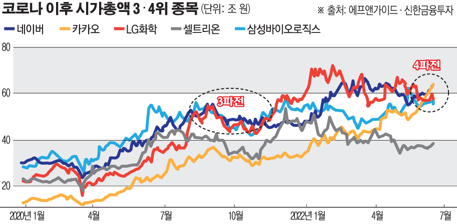 현재까지 시가총액 상위를 꾸준히 지킨 종목은 삼성전자, SK하이닉스, LG화학, 삼성바이오로직스, 셀트리온, 현대차 등 6개로 나타났다. 반면 기존 '10대 종목'이었던 현대모비스, 신한지주, 포스코, SK텔레콤 4개는 지난해 자리를 내줬다. 새롭게 진입한 종목은 삼성SDI, 네이버, 카카오, 기아 등이다.