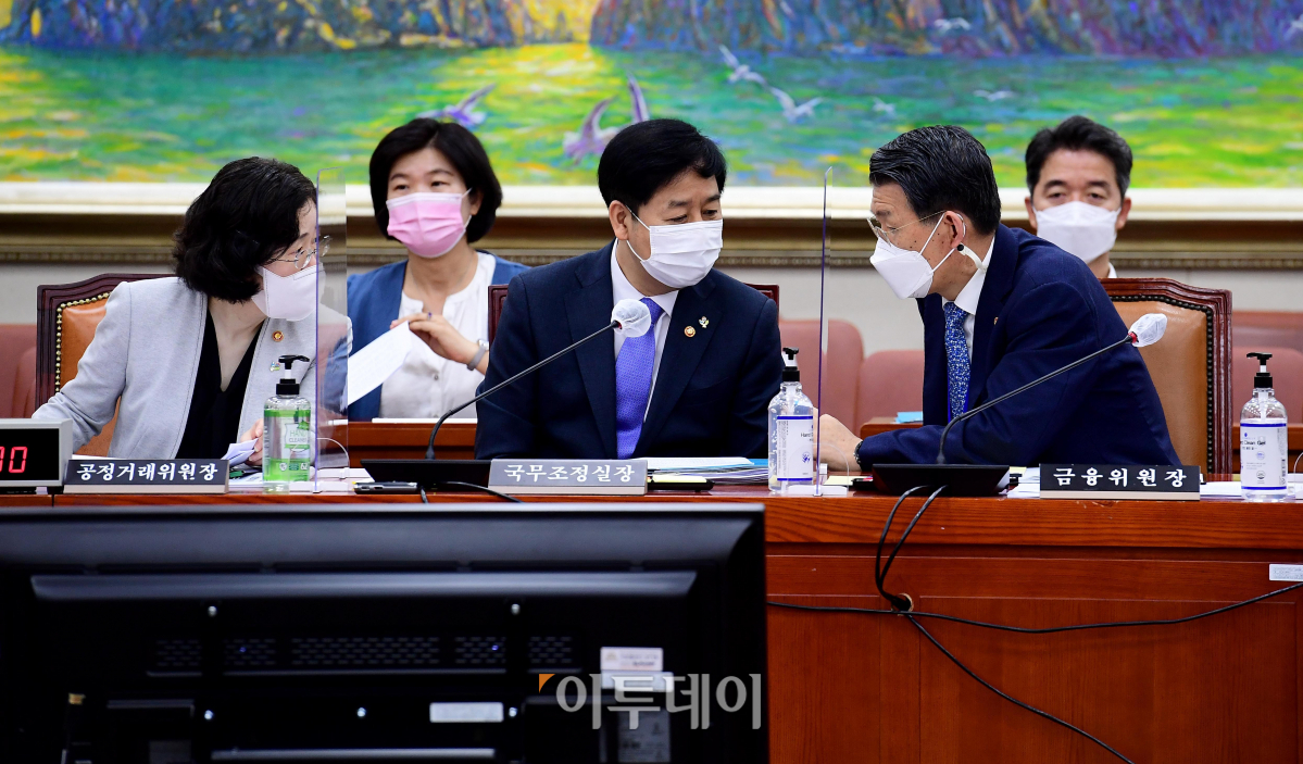 22일 서울 여의도 국회에서 열린 정무위원회 전체회의에 앞서 조성욱(왼쪽부터) 공정거래위원장, 구윤철 국무조정실장, 은성수 금융위원장이 대화하고 있다.
