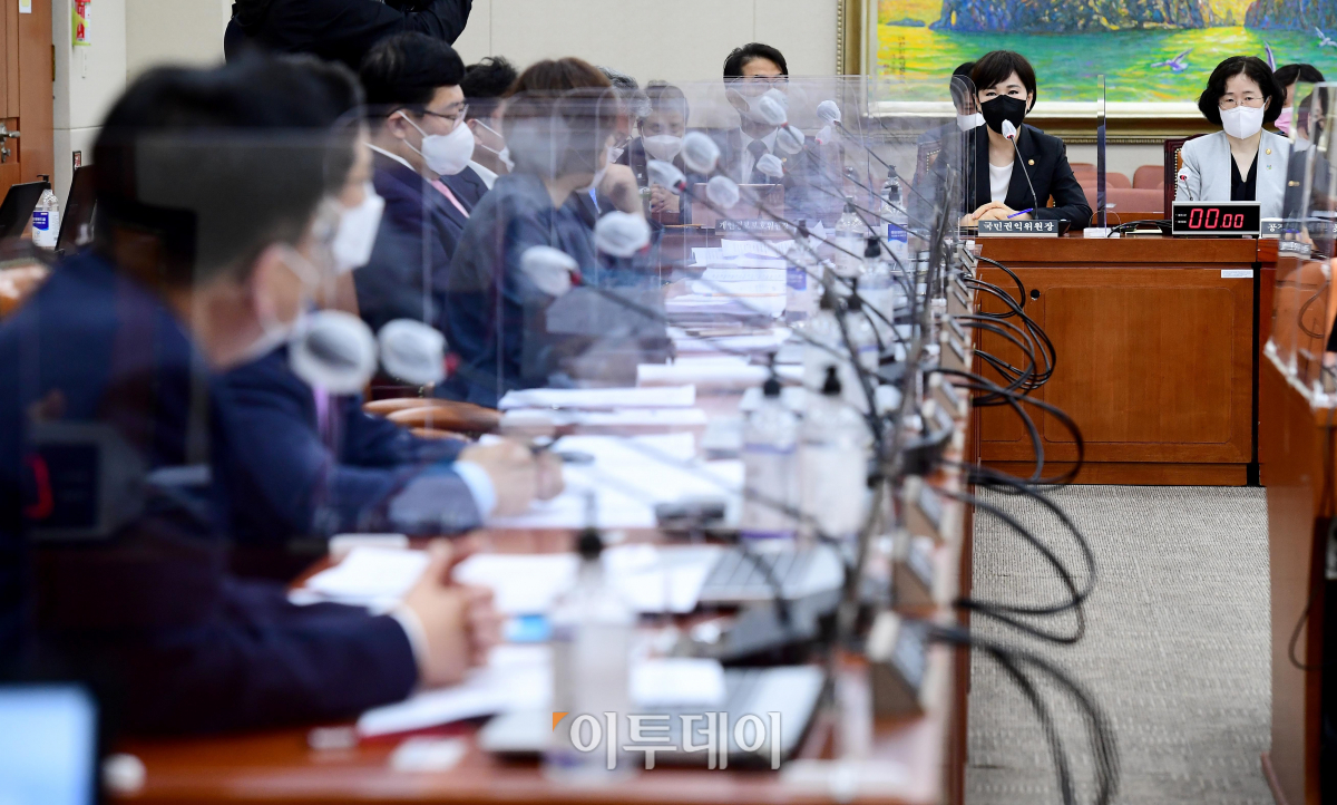 22일 서울 여의도 국회에서 열린 정무위원회 전체회의에서 전현희 국민권익위원장이 김희곤 국민의힘 의원의 질의에 답하고 있다.