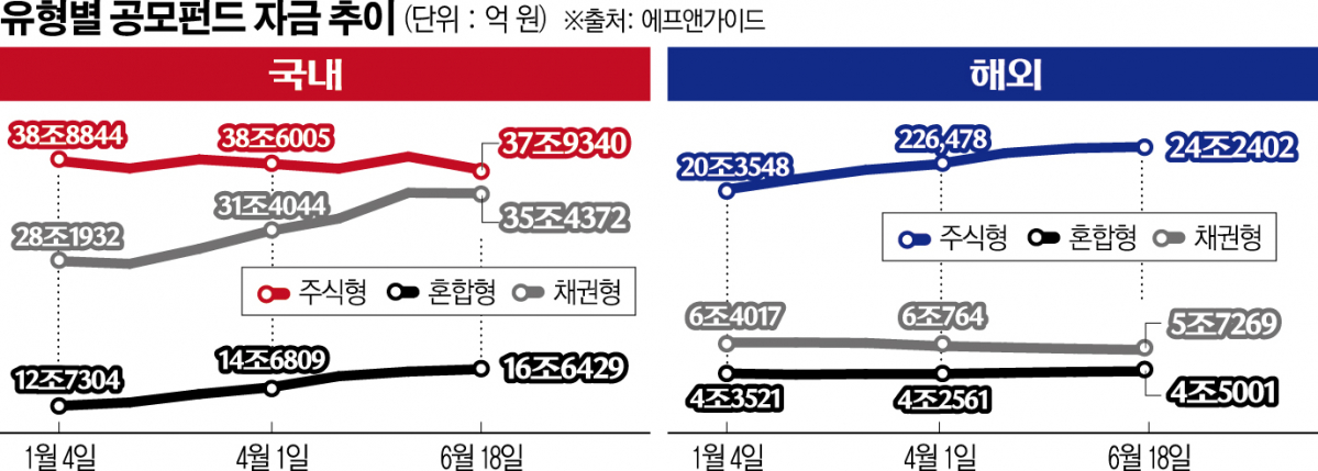 해외주식, 채권펀드에 대한 관심도 높아졌다. 해외주식형 공모펀드 설정액은 20조3548억 원에서 24조2402억 원으로 증가했다. 해외혼합형 공모펀드는 4조3521억 원에서 4조5001억 원으로 비슷한 규모를 유지했다.