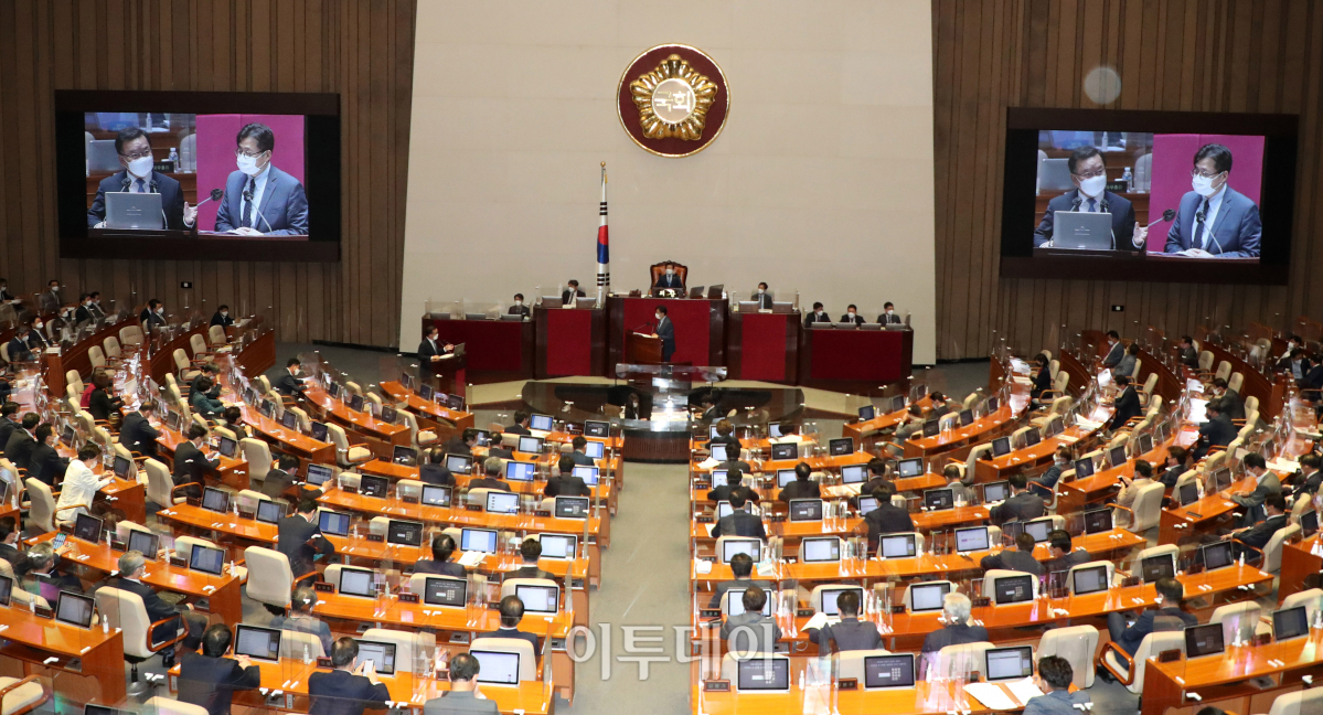 김부겸 국무총리가 22일 오후 서울 여의도 국회에서 열린 본회의 정치·외교·통일·안보 분야 대정부질문에서 홍익표 더불어민주당 의원의 질의에 답변하고 있다.