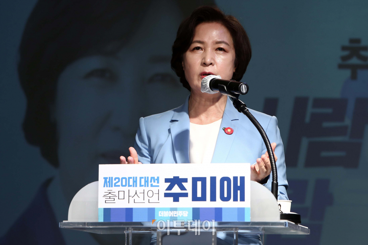 추미애 전 법무부 장관이 23일 경기 파주시 한 스튜디오에서 ‘사람이 높은 세상’이라는 슬로건을 걸고 대선 출마를 선언하고 있다. 국회사진취재단
