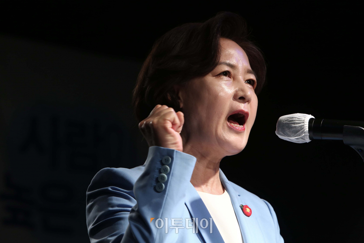 추미애 전 법무부 장관이 23일 경기 파주시 한 스튜디오에서 ‘사람이 높은 세상’이라는 슬로건을 걸고 대선 출마를 선언하고 있다. 국회사진취재단