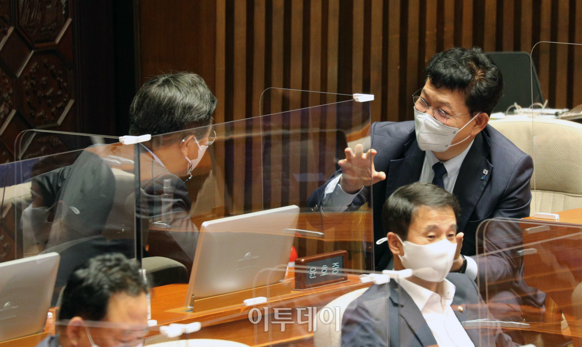 23일 오후 경제분야 대정부 질문이 열린 국회 본회의장에서 송영길 더불어민주당대표(오른쪽)와 윤호중 원내대표가 이야기를 나누고 있다.