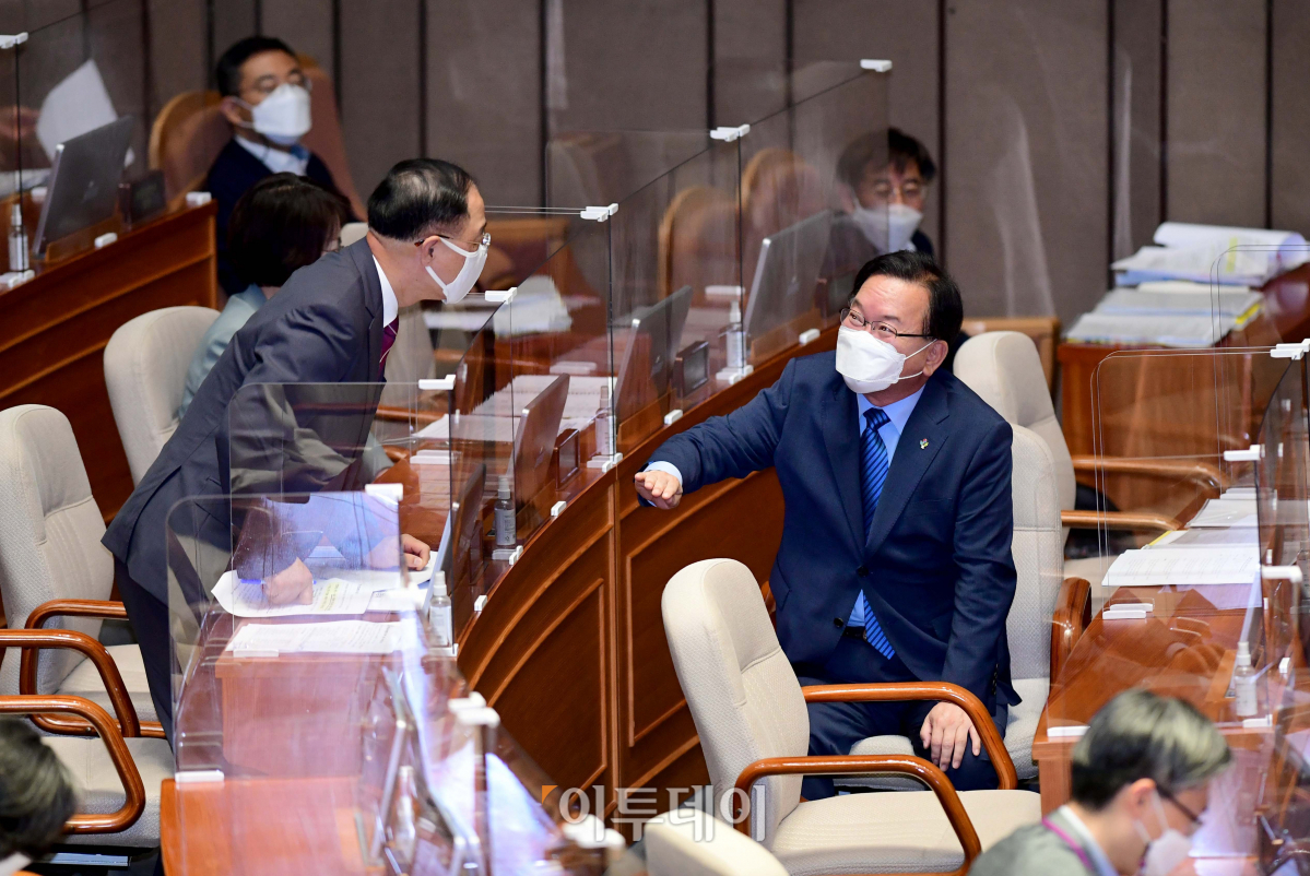 23일 서울 여의도 국회 본회의장에서 열린 경제분야 대정부질문에서 김부겸(오른쪽) 국무총리와 홍남기 부총리 겸 기획재정부 장관이 대화하고 있다.