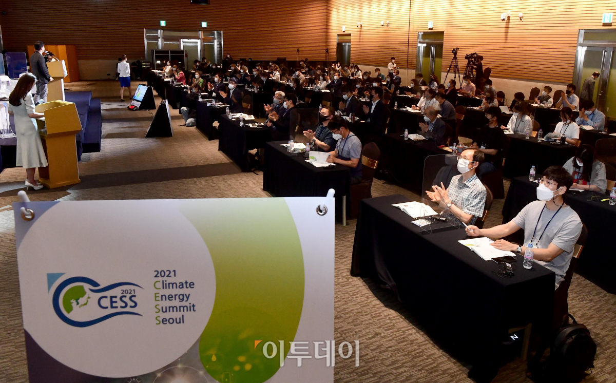 24일 서울 여의도 전경련회관 컨퍼런스센터에서 열린 ‘서울 기후-에너지 회의 2021’에서 참석자들이 연사의 발표를 들은 뒤 박수치고 있다. 이투데이와 기후변화센터가 주최한 서울 기후-에너지 회의 2021은 2050 탄소중립 달성을 위한 지속가능한 폐자원 활용을 통해 그린오션 비즈니스의 가치를 논의하는 자리다.