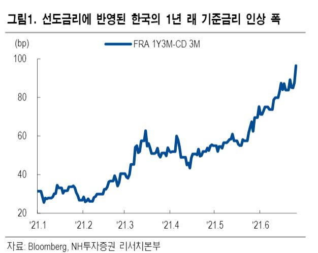 소비 여력 측면에서 살펴보면, 현재 우리나라의 이자 부채 규모는 3926조 원(1분기 기준)으로 집계된다. 이를 고려하면 한 차례 금리 인상은 경제주체의 소비 여력을 대략 9조8100억 원을 줄이는 효과가 있는 것으로 NH투자증권은 봤다.