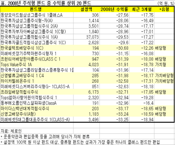 삼성그룹 처럼 특정 유형에만 집중 투자하는 테마형펀드와 인덱스펀드 9개를 제외할 경우 총 11개 펀드중에서 8개 펀드가 가치형과 배당형펀드로 조사됐다.