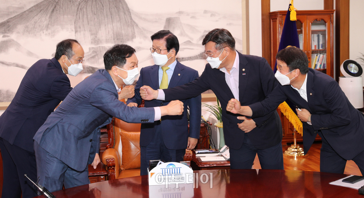 28일 오전 국회 박병석 의장실에서 교섭단체인 윤호중 더불어민주당 원내대표와 김기현 원내대표 및 원내대표단들이 인사를 나누고 있다.