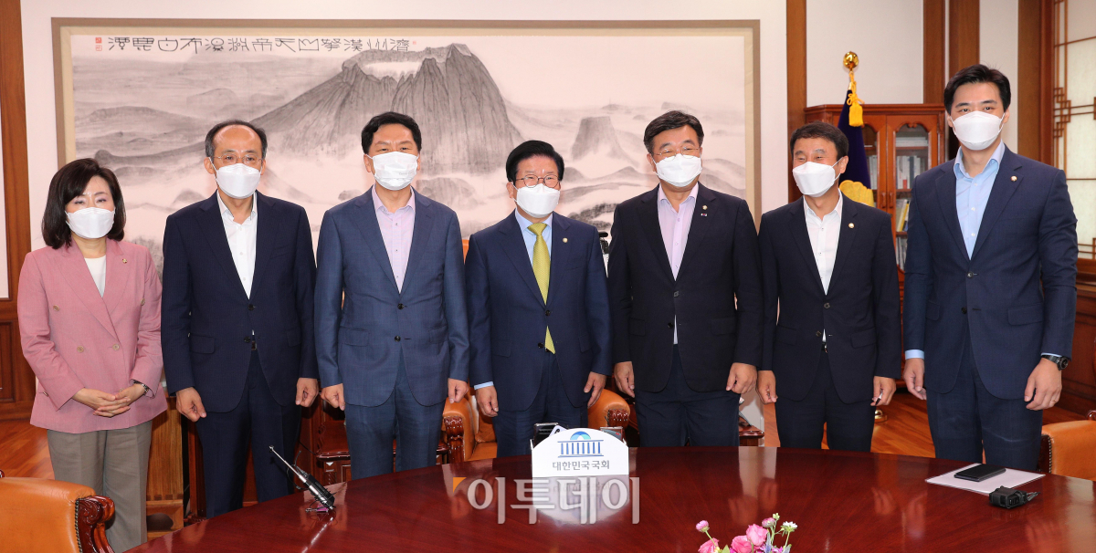 28일 오전 국회 박병석 의장실에서 교섭단체인 윤호중 더불어민주당 원내대표와 김기현 원내대표가 만나 현안과 관련 이야기에 앞서 함께 참석한 원내대표단들이 기념사진을 찍고 있다.