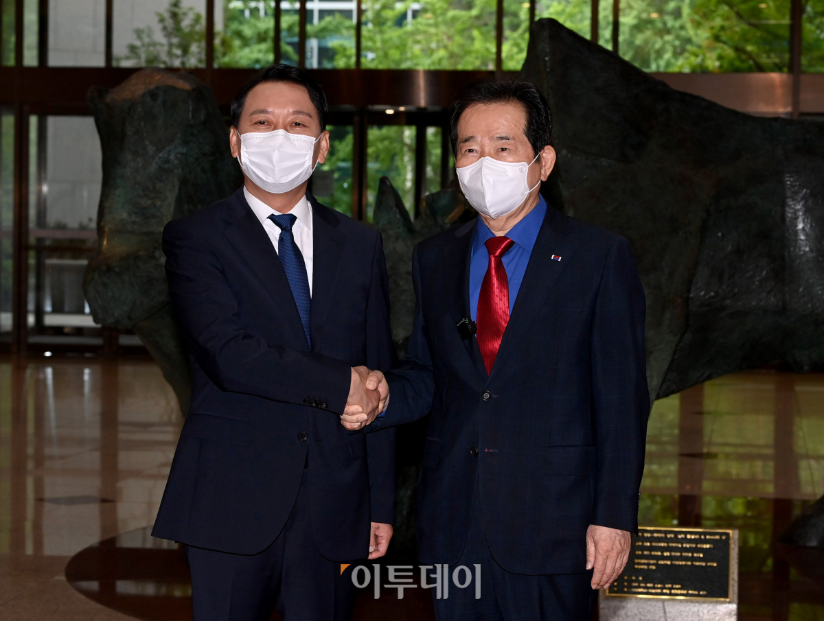여권 대선 후보인 정세균 전 국무총리와 이광재 더불어민주당 의원이 28일 오전 서울 영등포구 한국거래소에서 단일화 추진 발표 기자회견에 앞서 악수를 나누고 있다.