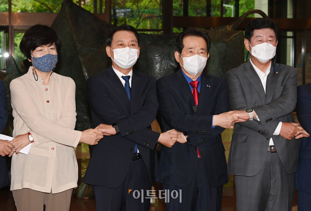 여권 대선 후보인 정세균 전 국무총리와 이광재 더불어민주당 의원이 28일 오전 서울 영등포구 한국거래소에서 단일화 추진 발표 기자회견에 앞서 결의를 다지고 있다.