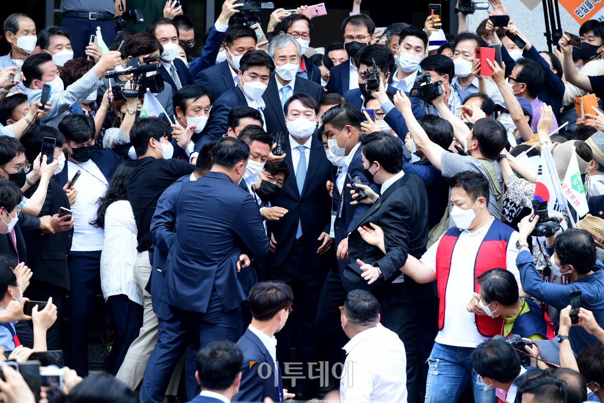 윤석열 전 검찰총장이 29일 서울 서초구 매헌윤봉길의사기념관에서 대선 출마 기자회견을 마친 뒤 나서고 있다.