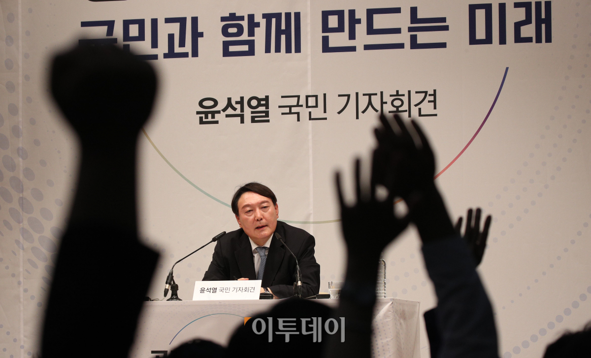 윤석열 전 검찰총장이 29일 오후 서울 서초구 매헌 윤봉길 의사 기념관에서 대선출마 선언 뒤 기자들과 일문일답을 하고 있다.