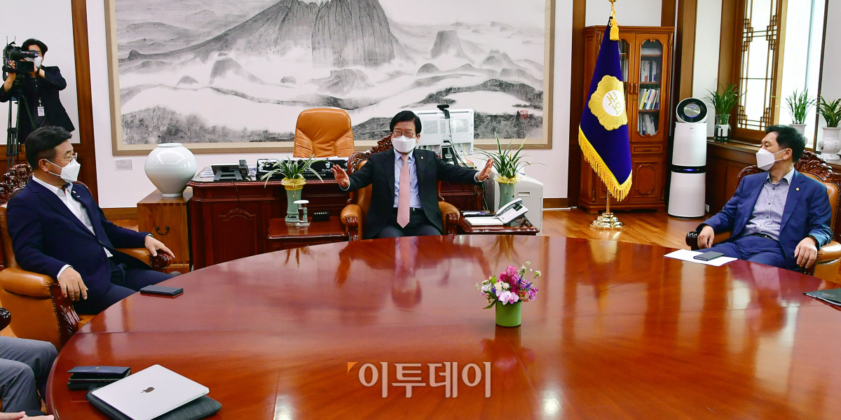 박병석 국회의장(가운데)과 더불어민주당 윤호중 원내대표(좌측), 국민의힘 김기현 원내대표가 30일 오전 국회 의장실에서 국회의장-교섭단체 원내대표 회동 갖고 있다.