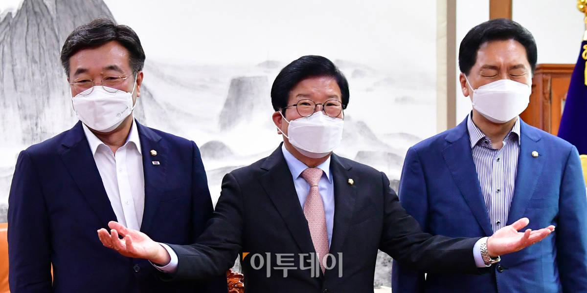 박병석 국회의장(가운데)과 더불어민주당 윤호중 원내대표(좌측), 국민의힘 김기현 원내대표가 30일 오전 국회 의장실에서 국회의장-교섭단체 원내대표 회동 참석하며 기념촬영을 하고 있다.