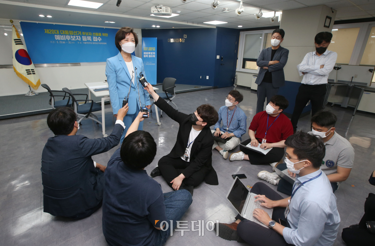 추미애 전 법무부 장관이 30일 오전 서울 여의도 더불어민주당 중앙당사에서 제20대 대통령 선거 후보자 선출을 위한 예비후보자 등록을 마친 뒤 기자들과 질의응답을 하고 있다.