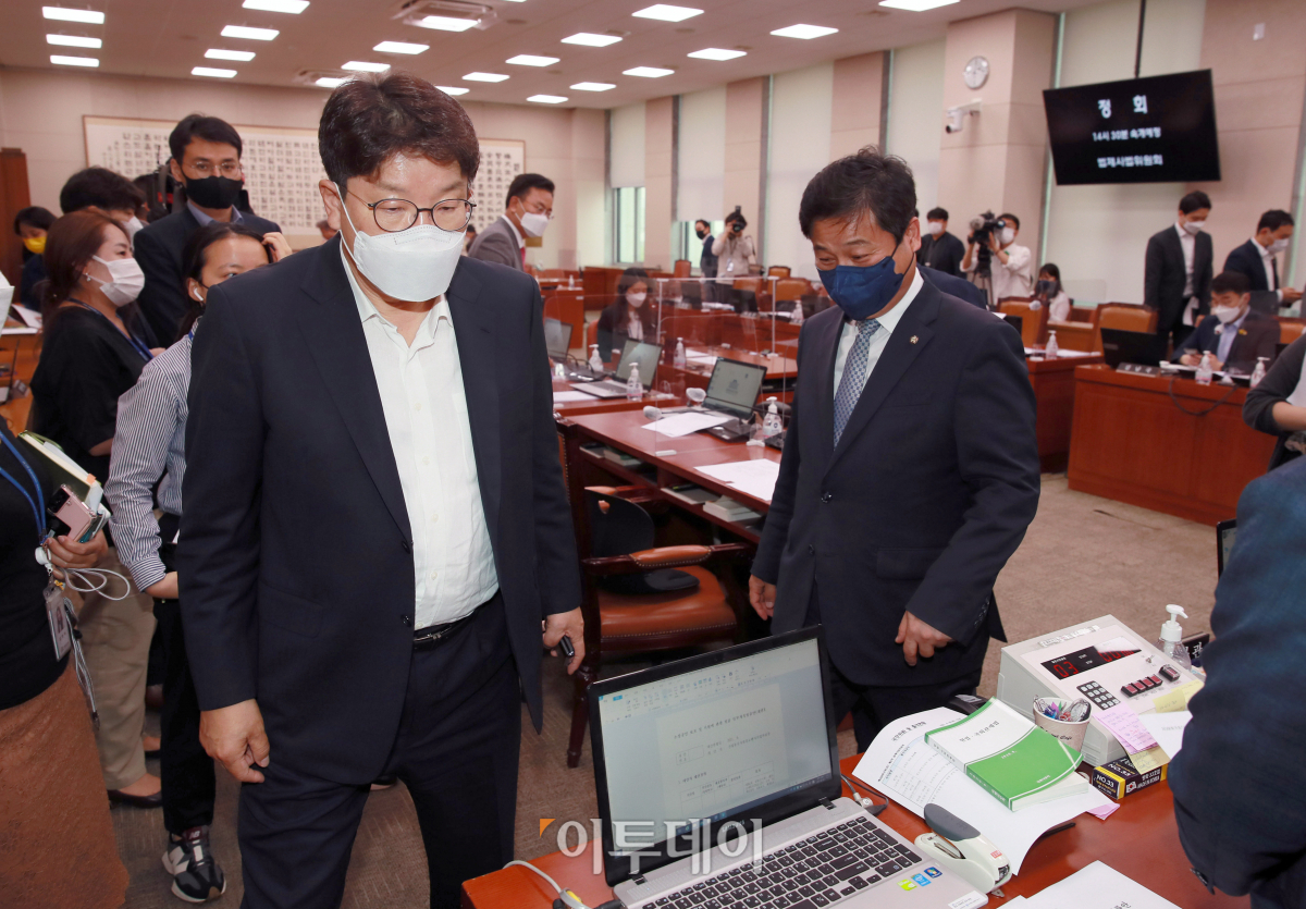 권성동(왼쪽) 국민의힘 의원, 김영배 더불어민주당 의원 등 여야 의원들이 30일 오후 여의도 국회에서 열린 법제사법위원회 전체회의가 정회 선언되자 회의장을 나가고 있다.