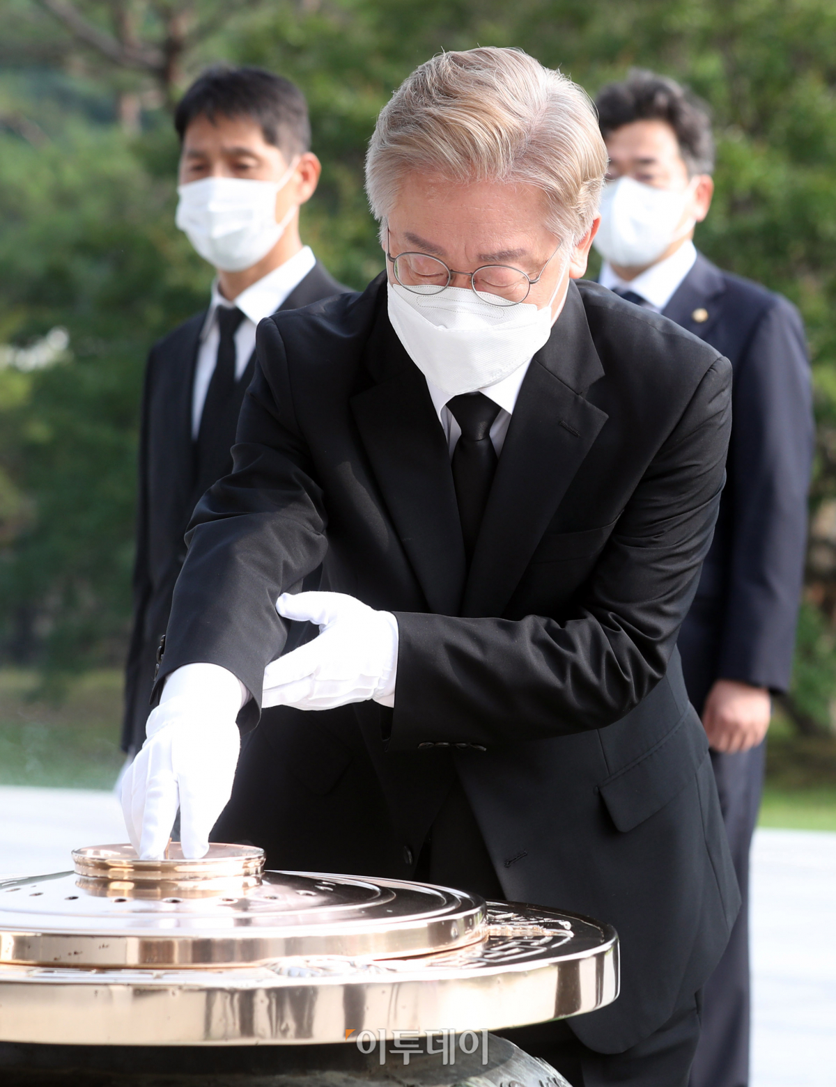 대선 출마를 선언한 이재명 경기도지사가 1일 오전 서울 동작구 국립현충원을 찾아 현충탑을 참배하고 있다. 국회사진취재단