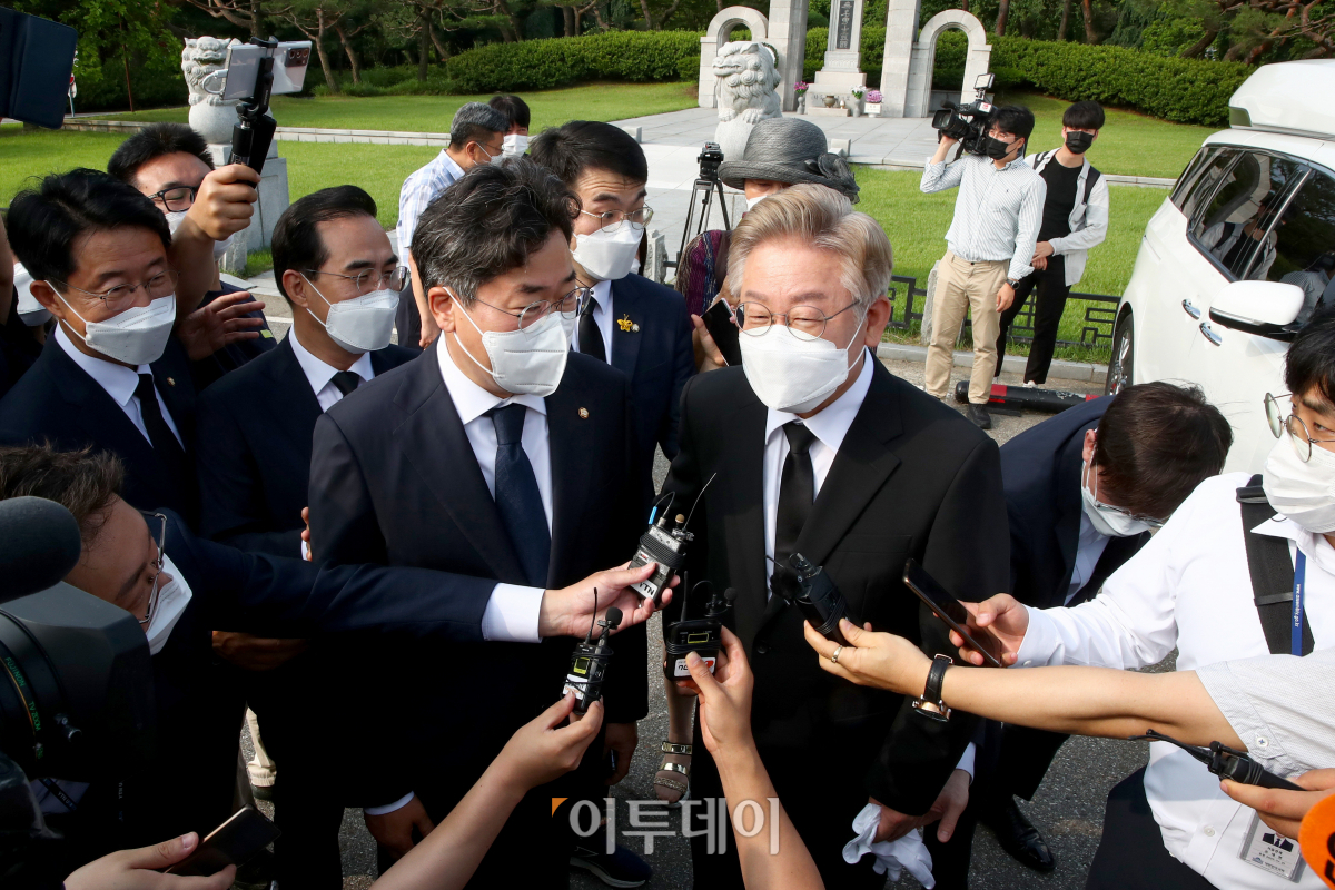 대선 출마를 선언한 이재명 경기도지사가 1일 오전 서울 동작구 국립현충원을 찾아 학도의용군 무명용사탑 참배를 마친 뒤 취재진의 질문을 받고 있다. 국회사진취재단