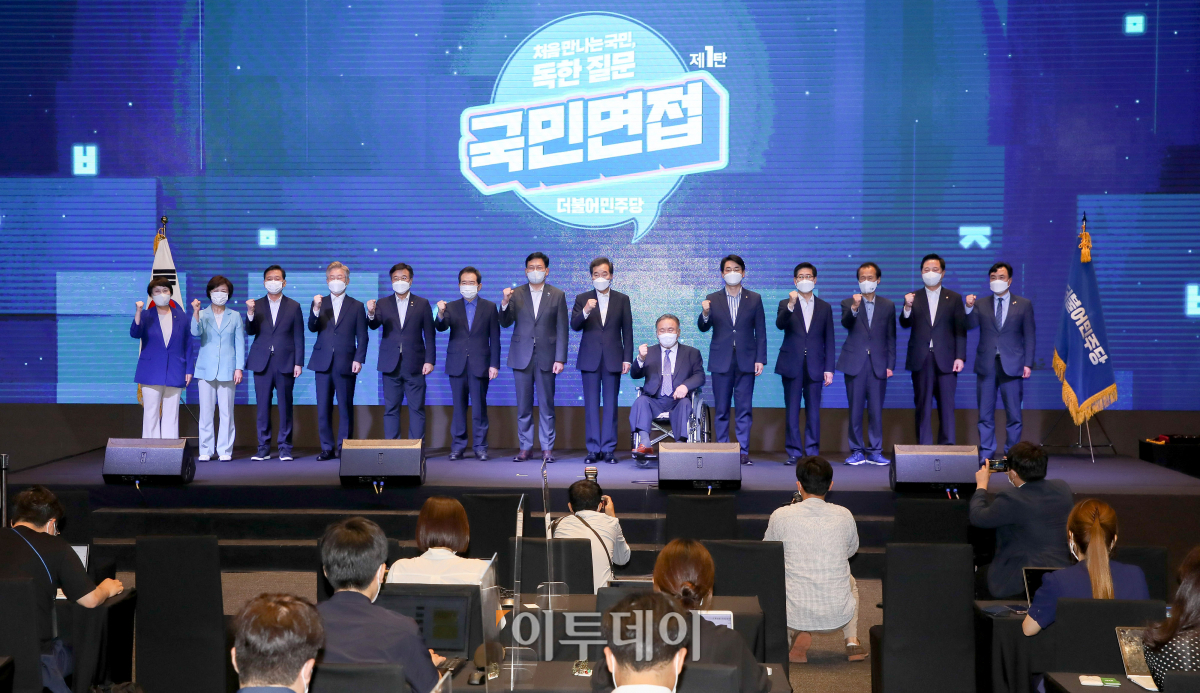 1일 서울 여의도 글래드호텔에서 열린 더불어민주당 공명선거 실천 서약식 및 프레스데이에서 대선 후보들이 기념촬영을 하고 있다.