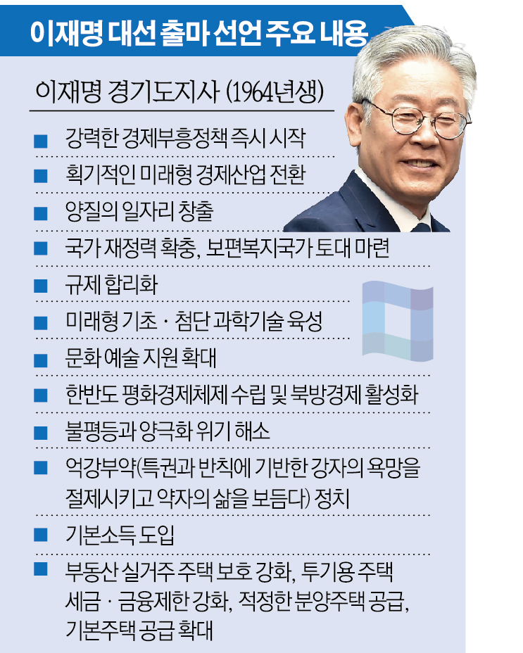 이 지사는 유튜브와 페이스북 등을 통해 공개한 ‘새로운 대한민국! 이재명은 합니다!’ 영상 선언문에서 “새로운 대한민국, 더 나은 국민의 삶으로 보답하겠다”고 밝혔다.
