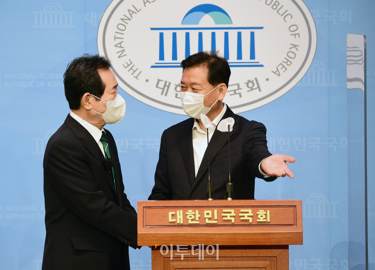 민주당 대선 경선 후보인 정세균 전 국무총리와 이광재 의원이 5일 국회 소통관에서 기자회견을 열고 정세균 전 총리로 후보 단일화 합의를 밝힌 뒤 악수를 나누고 있다. 신태현 기자 holjjak@