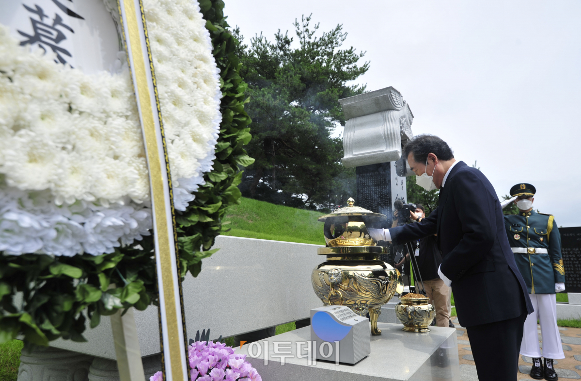 대선 출마를 공식 선언한 이낙연 더불어민주당 전 대표가 5일 오전 서울 동작구 국립서울현충원에서 김대중 대통령 묘역을 참배하고 있다. 이 전 대표는 이날 오전 유튜브 '이낙연TV'를 통해 공식적으로 대선 출마 선언을 했다. 국회사진취재단