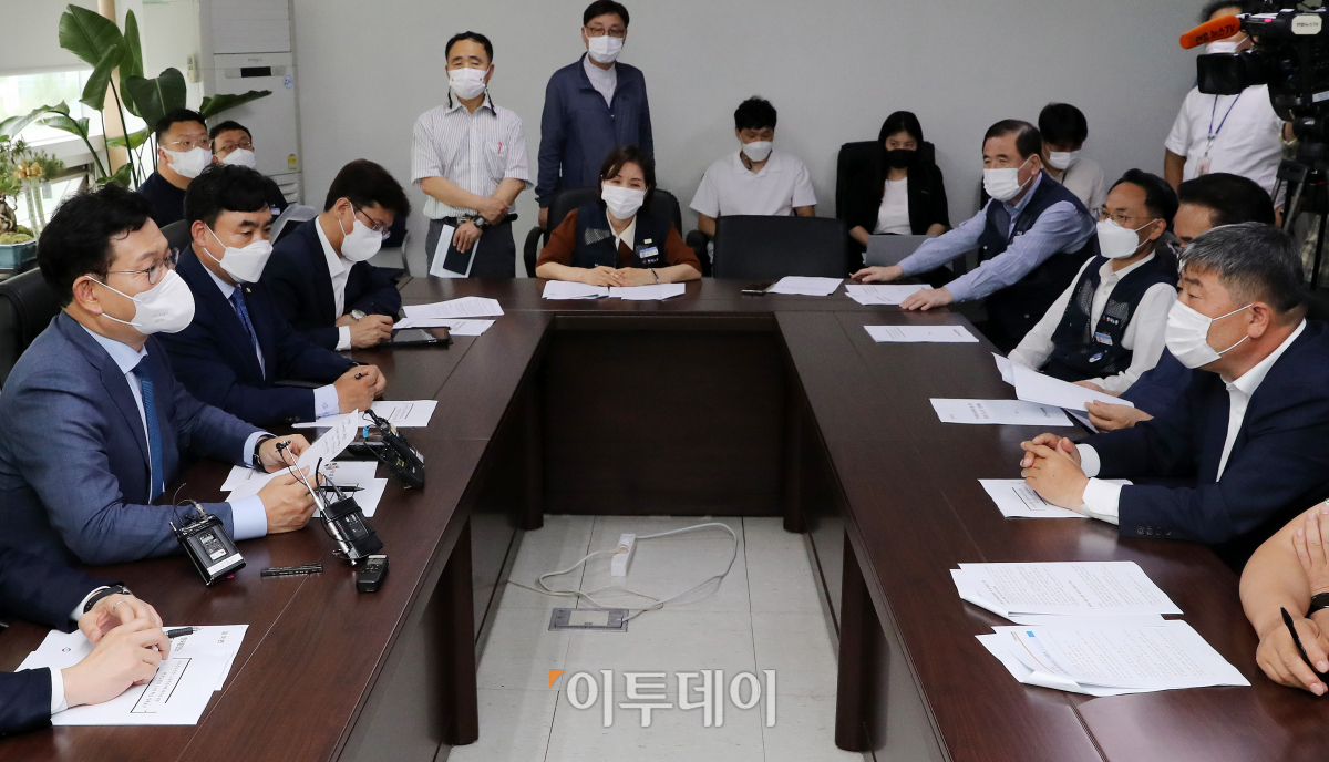 송영길 더불어민주당 대표(왼쪽)가 5일 오후 서울 여의도 한국노총에서 김동명 한국노총 위원장을 예방해 발언하고 있다.
