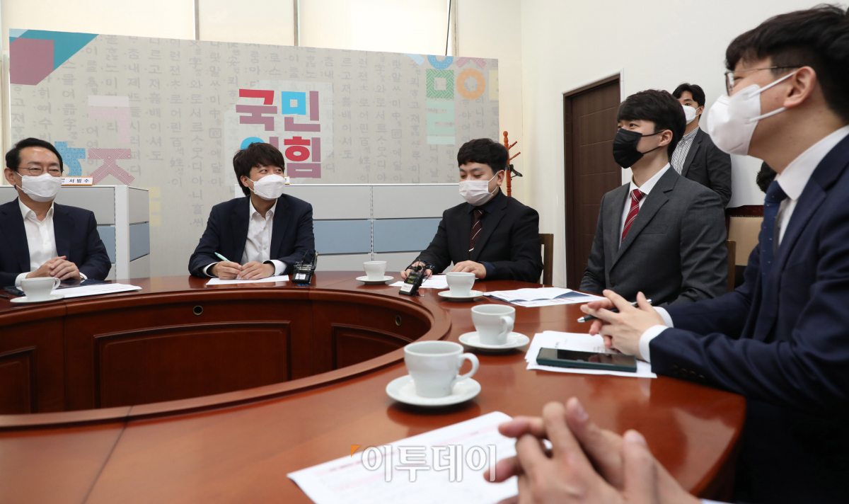 국민의힘 이준석 대표와 신임 대변인단 내정자들이 6일 오전 국회 당대표실에서 티타임을 갖고 있다.