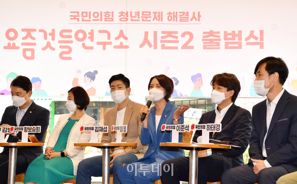 이준석 국민의힘 대표는 6일 여의도 하우스카페에서 열린 국민의힘 청년문제 해결사 '요즘것들 연구소' 시즌2 출범식에 참석했다. 연구소 시즌2 소장을 맡은 이영 의원이 인사말을 하고 있다.