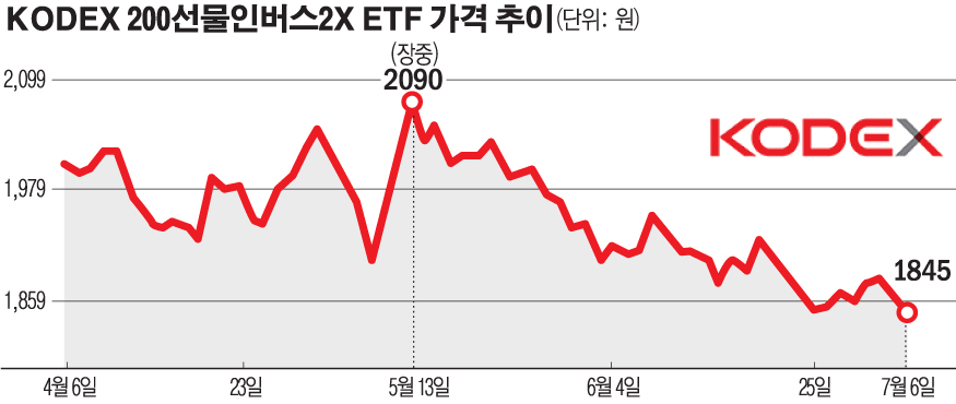인버스 ETF는 코스피200 선물지수를 기준으로, 지수가 떨어질 때 수익을 내는 상품이다. 지수가 하락해야 이득을 보고, 지수가 오른다면 손해를 보는 구조다. 이른바 곱버스로 불리는 KODEX200선물인버스2X는 하루 수익률을 기준으로 마이너스(-)의 2배를 추종한다.