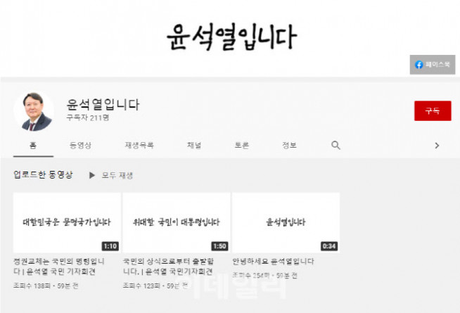7일 윤석열 전 총장 캠프 측은 ‘윤석열입니다’라는 제목으로 지난 1일 채널을 개설했다. 현재 이 채널에는 3개의 동영상이 올라와 있다.