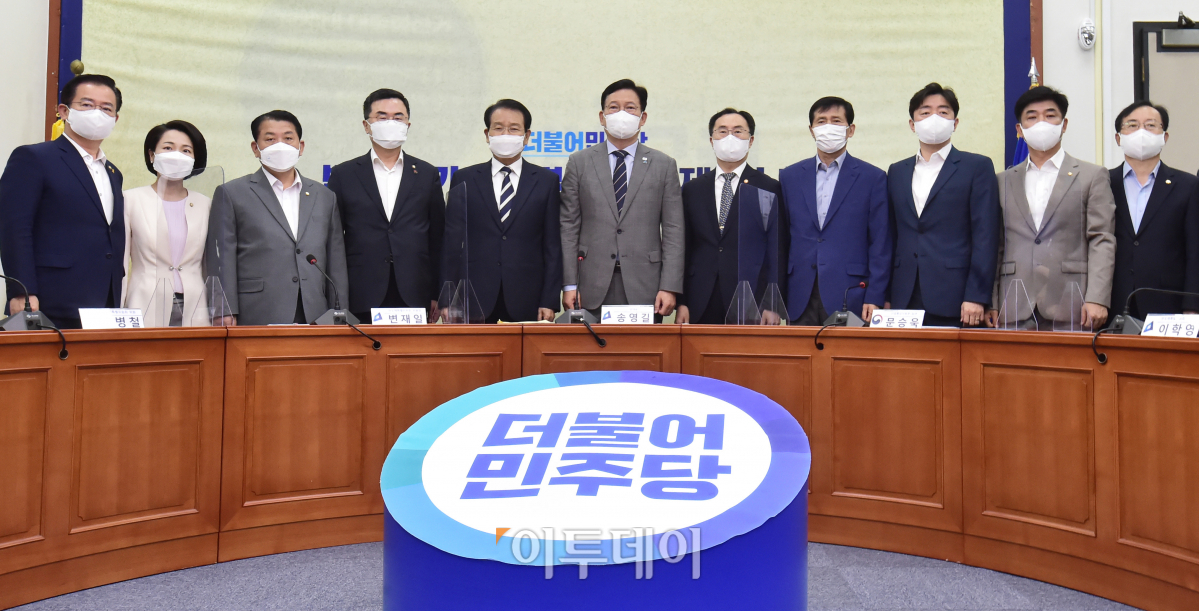 송영길 대표, 변재일 반도체기술특별위원회 위원장, 문승욱 산업통상자원부 장관이 7일 서울 여의도 국회 본관 206호에서 열린 더불어민주당 반도체 기술특별위원회 제6차 회의에 참석, 기념촬영을 갖고 있다. 이날 회의에는 송영길 더불어민주당 대표, 변재일 반도체기술특별위원회 위원장, 문승욱 산업통상자원부 장관 등이 참석한 가운데 그동안 특위에서 논의했던 반도체 산업 지원책 성과 발표와 발의 지원 법안 등을 검토 후 총괄 발표할 예정이다.