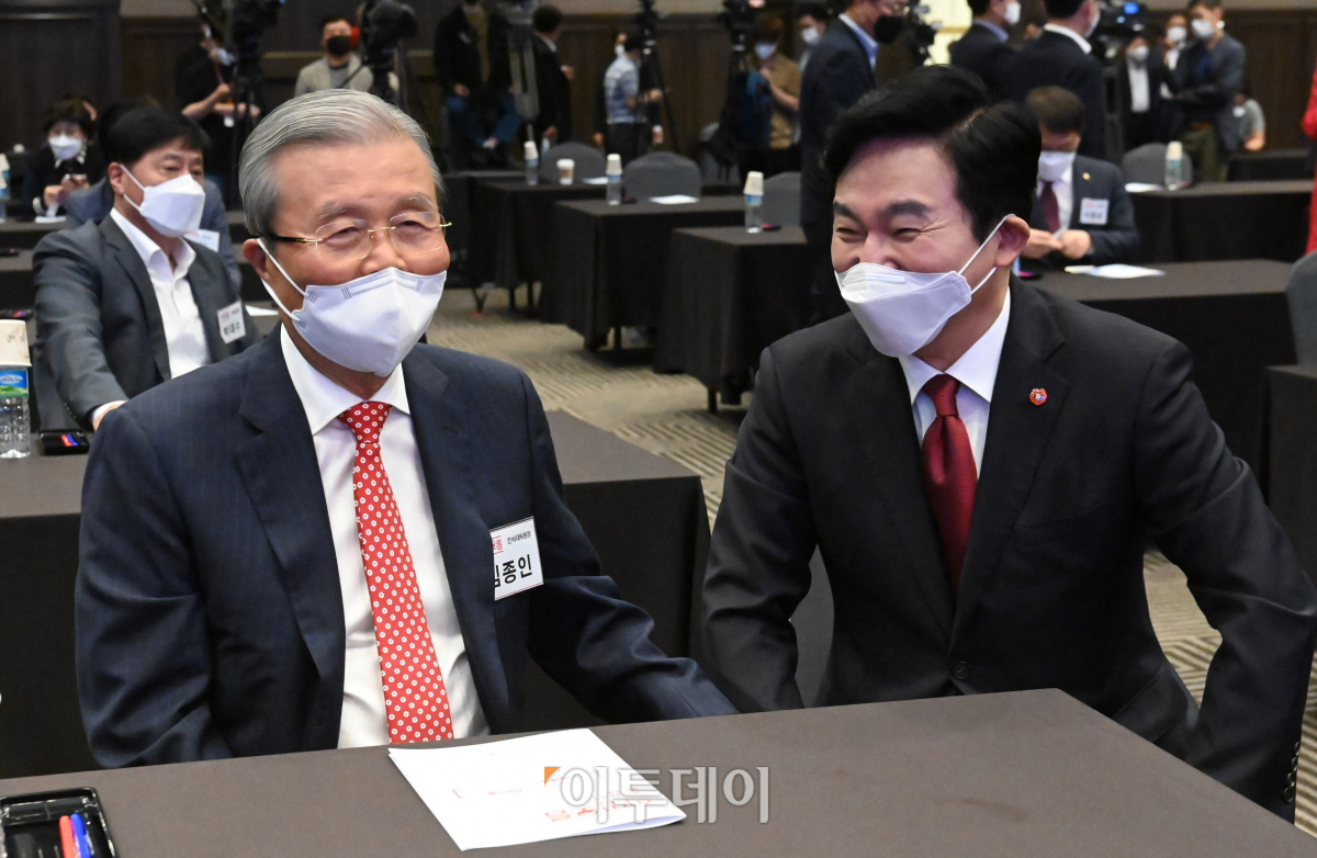7일 오전 서울 영등포구 중소기업회관에서 열린 원희룡 제주지사 지지 현역 국회의원 모임인 '희망오름' 출범식에 앞서 김종인 (왼쪽) 전 국민의힘 비대위원장과 원희룡 지사가 이야기를 나누고 있다.