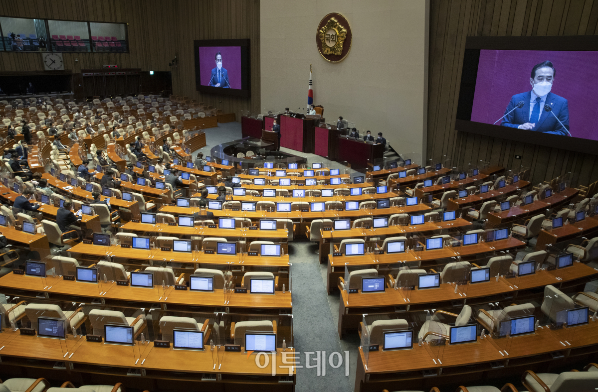 박홍근 신임 예산결산위원장이 8일 국회 본회의에서 국민의힘 의원들이 퇴장한 가운데 인사말을 하고 있다.