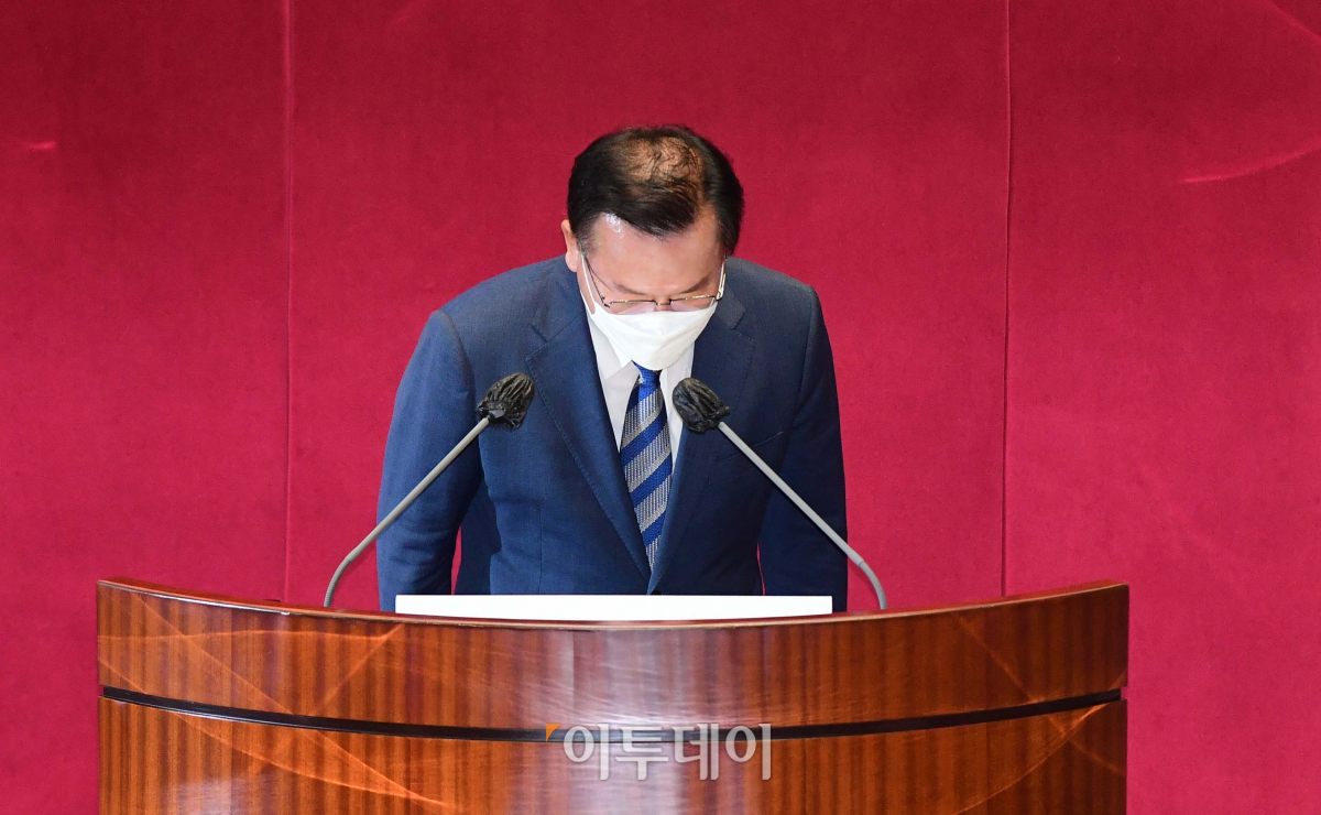 김부겸 국무총리가 8일 오전 서울 여의도 국회에서 열린 본회의에서 2차 추경안 관련 정부 시정연설을 하고 있다.