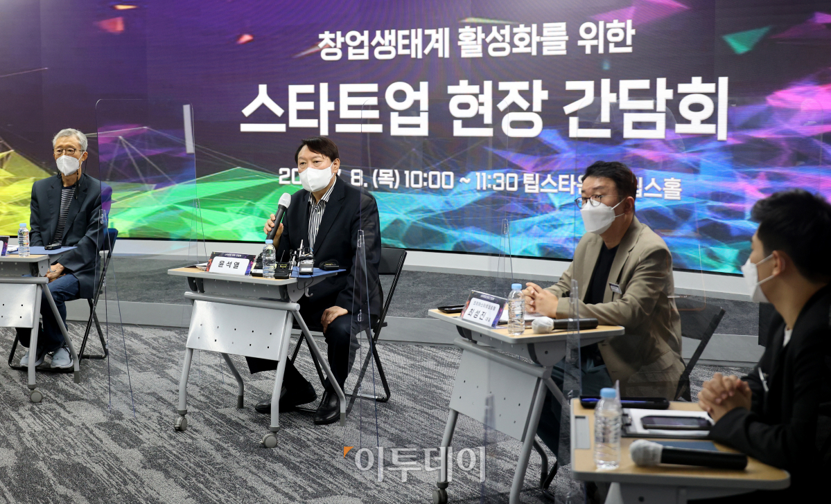 윤석열 전 검찰총장이 8일 오전 서울 강남구 역삼동 팁스타운에서 열린 ‘창업생태계 활성화를 위한 스타트업 현장 간담회’에 참석해 스타트업 대표들과 스타트업 육성 방안 등을 놓고 이야기를 나누고 있다. 국회사진취재단