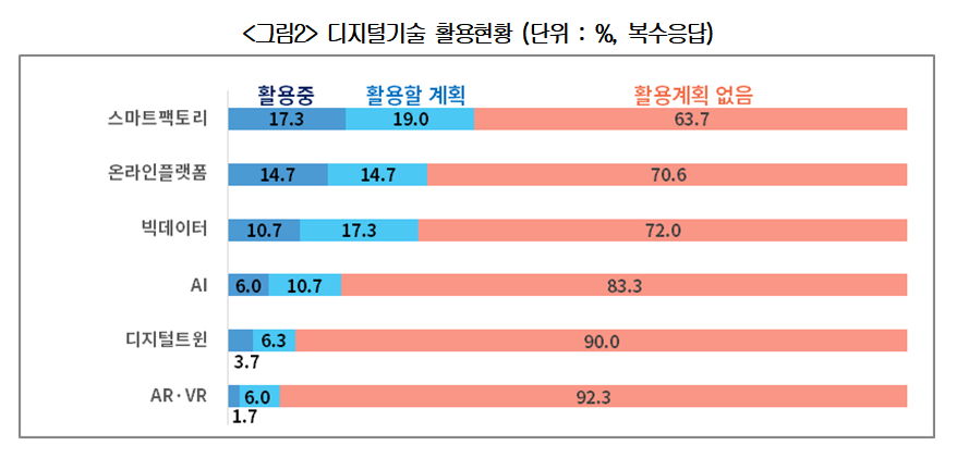 디지털 기술 가운데 활용 중이거나 활용계획이 있는 분야로는 ‘스마트공장·로봇’이 가장 많이 꼽혔지만, 그 비율이 36.3%에 불과했다. ‘온라인플랫폼 구축·연계’(29.4%), ‘빅데이터’와 ‘AI’ 관련 응답은 각각 28.0%와 16.7%에 그쳤다.